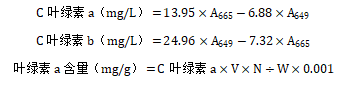 植物叶绿素检测SOP发表时间:2024-08-19 15:17 1 范围 适用于水果、蔬菜及其制品中叶绿素a含量、叶绿素b含量和叶绿素总含量的测定。 2 原理 根据叶绿体色素提取液对可见光谱的吸收,利用分光光度计在某一特定波长测定其吸光度,即可用公式计算出提取液中各色素的含量。 3 设备 分光光度计 4 试剂 4.1 95%乙醇 5 实验步骤 5.1 样品制备 称取0.2g新鲜样品于25ml容量瓶中,加入约10mL95%乙醇(避光提取),期间注意振荡,当样品组织变白后,加入95%乙醇定容。 5.2 样品测定 把提取液倒入1cm光径比色皿中,以95%乙醇为空白,在波长665nm、649nm下测定吸光度。 6 结果计算